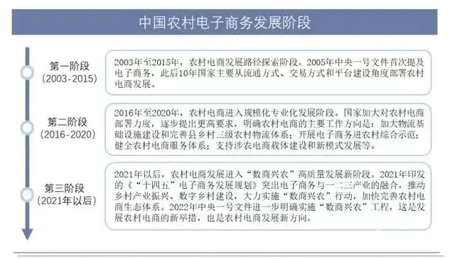 電子商務是我國數(shù)字經(jīng)濟的重要源頭,是數(shù)字經(jīng)濟最活躍、最集中的新產(chǎn)業(yè)新業(yè)態(tài)新模式,是數(shù)字經(jīng)濟最重要的組成部分。實踐證明,農(nóng)村電商是發(fā)展數(shù)字經(jīng)濟、鄉(xiāng)村振興和數(shù)字鄉(xiāng)村建設最好的抓手,在十幾年的發(fā)展中,我國農(nóng)村電商發(fā)展進程大體可分為三個階段。