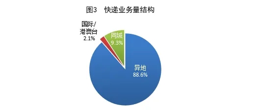 1-4月,同城、異地、國際/港澳臺快遞業(yè)務量分別占全部快遞業(yè)務量的9.3%、88.6%和2.1%。與去年同期相比,同城快遞業(yè)務量的比重下降0.2個百分點,異地快遞業(yè)務量的比重上升0.2個百分點,國際/港澳臺業(yè)務量的比重基本持平。