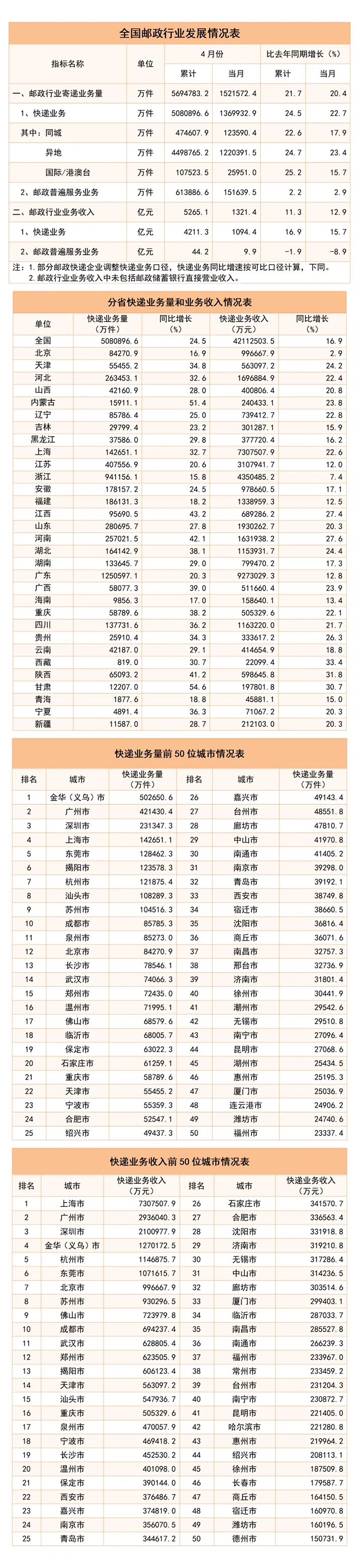 4月份,郵政行業(yè)寄遞業(yè)務量完成152.2億件,同比增長20.4%。其中,快遞業(yè)務量完成137.0億件,同比增長22.7%。