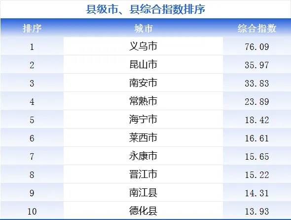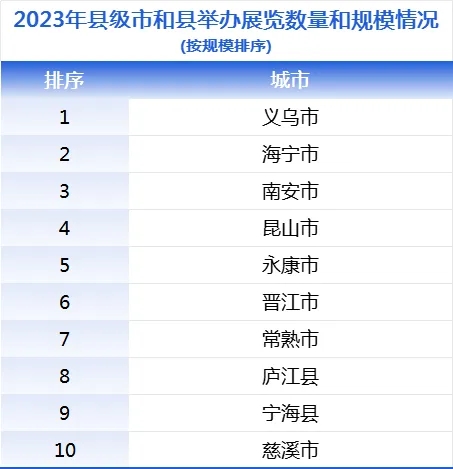 中國(guó)會(huì)展經(jīng)濟(jì)研究會(huì)線上發(fā)布的《2023年中國(guó)展覽數(shù)據(jù)統(tǒng)計(jì)報(bào)告》(以下簡(jiǎn)稱(chēng)《報(bào)告》)顯示,2023年,義烏會(huì)展綜合實(shí)力以絕對(duì)優(yōu)勢(shì)位列全國(guó)縣級(jí)市首位。排名前五名的分別為義烏、昆山、南安、常熟、海寧。