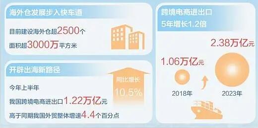 如今,分散在全球各地的海外倉連點(diǎn)成線、織線成網(wǎng),跨越山海開辟出海新路徑。海關(guān)總署發(fā)布的最新數(shù)據(jù)顯示,今年上半年,我國跨境電商進(jìn)出口1.22萬億元,同比增長10.5%,高于同期我國外貿(mào)整體增速4.4個百分點(diǎn)。從2018年的1.06萬億元,到2023年的2.38萬億元,5年間,我國跨境電商進(jìn)出口增長了1.2倍。