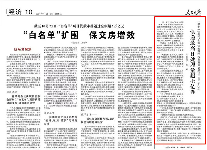媒體報(bào)道人民日?qǐng)?bào):快遞最高日處理量超七億件