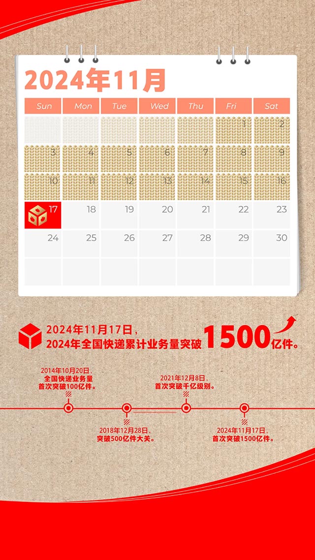 2024年11月17日16時29分,在國家郵政局郵政業(yè)安全中心中國快遞大數(shù)據(jù)平臺的大屏幕上,不斷滾動的數(shù)字彈出了“150000000000”的超長字符,我國快遞年業(yè)務量首次突破1500億件大關。與此同時,千里之外的甘肅天水,作為今年第1500億件快件——剛被極兔速遞快遞員攬收的一箱花牛蘋果,就已經(jīng)開始了奔向位于重慶的收件人的旅程,這位消費者幾個小時之前從拼多多平臺下了這一單。