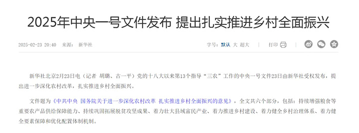 2月23日,2025年中央一號文件發(fā)布?!吨泄仓醒?國務院關于進一步深化農(nóng)村改革 扎實推進鄉(xiāng)村全面振興的意見》全文共六個部分,包括:持續(xù)增強糧食等重要農(nóng)產(chǎn)品供給保障能力、持續(xù)鞏固拓展脫貧攻堅成果、著力壯大縣域富民產(chǎn)業(yè)、著力推進鄉(xiāng)村建設、著力健全鄉(xiāng)村治理體系、著力健全要素保障和優(yōu)化配置體制機制。
