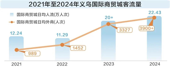 數(shù)據(jù)顯示,2024年,義烏國際商貿(mào)城日均客流22.43萬人次,同比增長12.15%;日均車流9.9萬車次,同比增長5.48%;外商日均到訪量超3900人次,同比增長17.22%,全年吸引進入市場的全球采購商超百萬人次,覆蓋230多個國家和地區(qū),市場主要客流量指標均創(chuàng)近10年新高,中東、東南亞、拉美等新興市場采購份額持續(xù)提升。