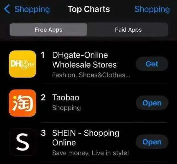 中國(guó)跨境電商應(yīng)用在美國(guó)火了!4月16日,美國(guó)iOS應(yīng)用商店電商應(yīng)用榜單前三均為中國(guó)APP,第一為敦煌網(wǎng),第二為淘寶,第三為希音Shein。