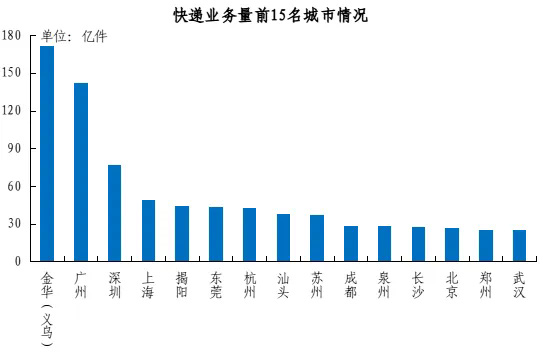 快遞業(yè)務收入排名前十五位的城市依次是上海、廣州、深圳、金華(義烏)、杭州、東莞、北京、蘇州、佛山、成都、鄭州、武漢、揭陽、汕頭和天津,其快遞業(yè)務收入合計占全部快遞業(yè)務收入的比重達到52.8%。