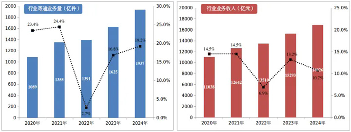 2024年郵政行業(yè)寄遞業(yè)務量完成1936.8億件,同比增長19.2%。其中,快遞業(yè)務量完成1750.8億件,同比增長21.5%。