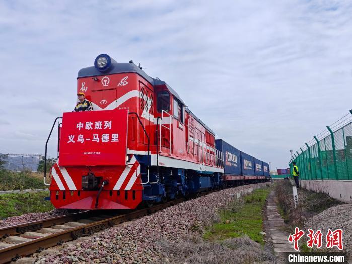 2024年11月18日,一趟滿載出口貨物的中歐班列從鐵路義烏西站駛出。 董易鑫 攝