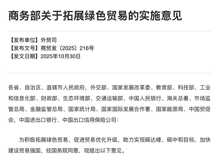 在全球綠色低碳轉(zhuǎn)型浪潮下,綠色貿(mào)易正成為國際經(jīng)貿(mào)競爭的新焦點。近日,商務(wù)部發(fā)布《關(guān)于拓展綠色貿(mào)易的實施意見》(以下簡稱《意見》),圍繞產(chǎn)品碳足跡、碳定價、綠證綠電等關(guān)鍵環(huán)節(jié)提出具體舉措,建立健全綠色貿(mào)易支撐保障體系。