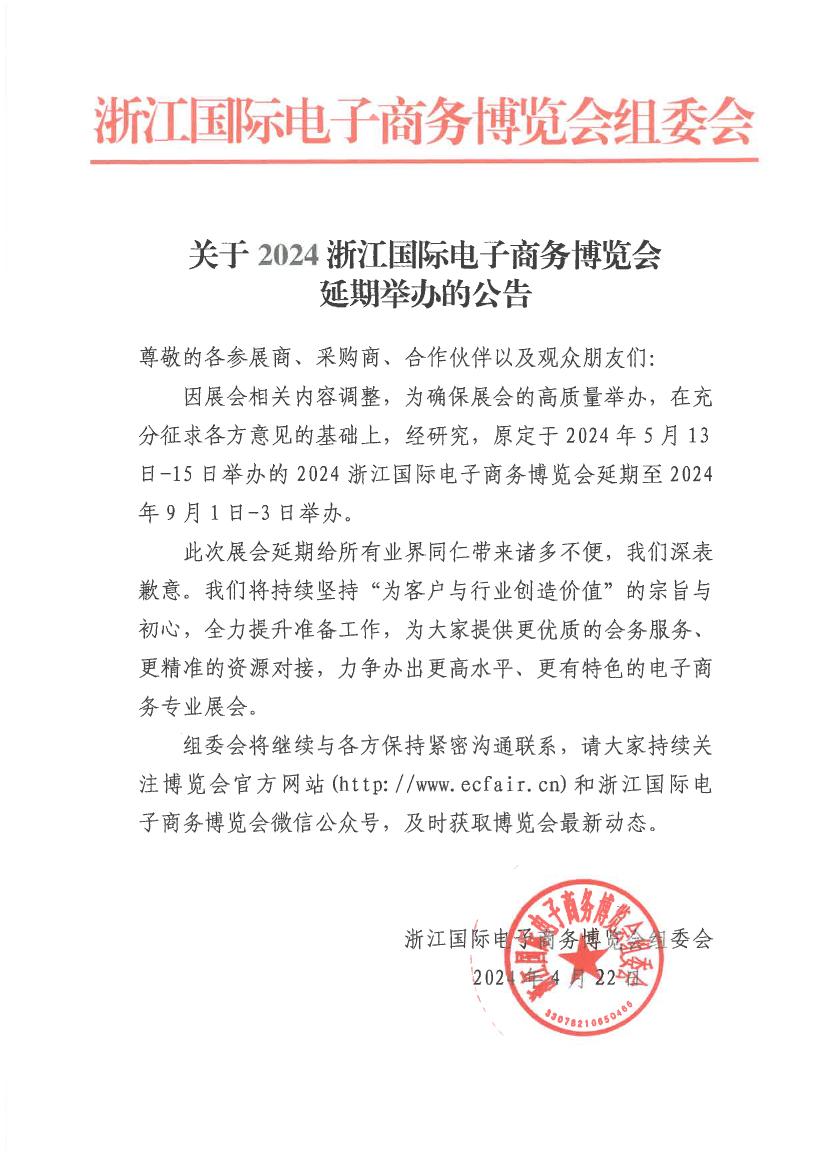 重要通知:2024電子商務(wù)博覽會(huì)延期舉辦公告